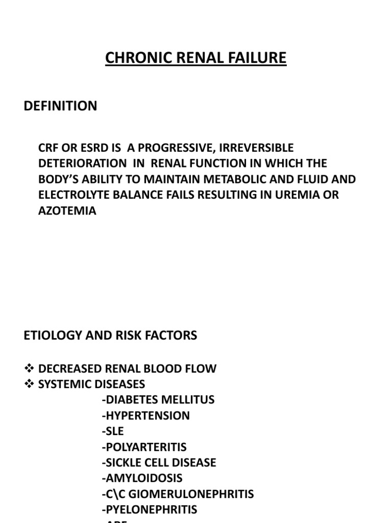 Chronic Renal Failure By Dr M S Magdi Awad Sasi Part 3 Renal Failure from img.pdfslide.net Definition of renal failure in famous dictionaries for free. What does renal failure mean? Renal failure means end stage renal failure representing as chronic irreversible failure of both kidneys to function, as a result of which regular renal dialysis is instituted or renal transplantation is carried out. Chronic renal failure is a slow, progressive decline of kidney function. Acute or chronic malfunction of the kidneys resulting from any of a number of causes. We were lucky on two counts: In his mind, he could see her as she. More than 30 different definitions have been used in the literature, creating much confusion and making.